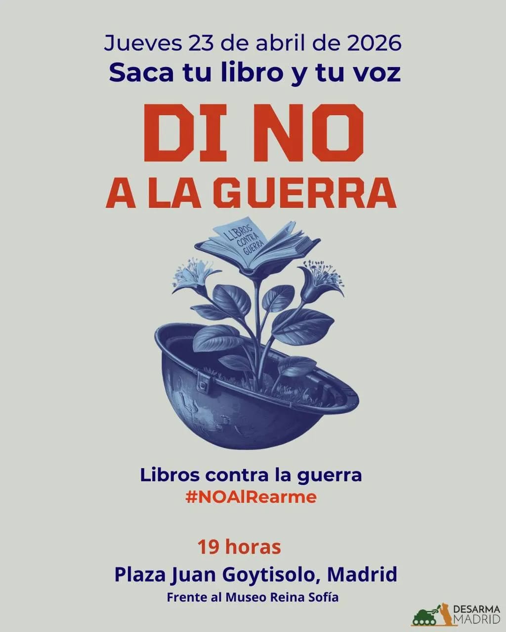 Nos sumamos a la iniciativa «Saca tu libro y tu voz. Di No a la Guerra» que el colectivo Desarma Madrid ha convocado para el 23 de abril a las 19 hs. en la plaza Juan Goytisolo de Madrid, frente al museo Reina Sofía. En estos tiempos donde la brutalidad militar y la devastación de la guerra se convierten en la principal amenaza para la vida, reivindicamos el poder y la necesidad de que la cultura se posicione del lado de la vida, de la dignidad, de la justicia, de la verdad, para crear una verdadera sociedad en paz.